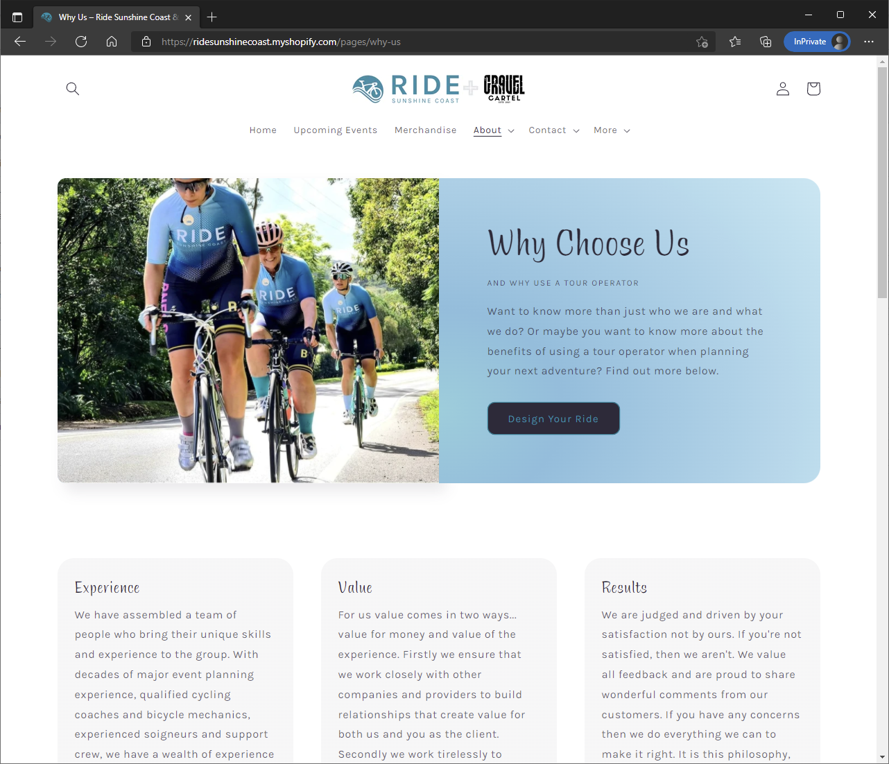 We assisted Ride Sunshine Coast to implement a new website which would meet their growing needs. We decided on a Shopify store with a range of customisations to cater for tours, events, packages and merchandise. We plan to continue assisting them to add new features and improve their digital presence.
